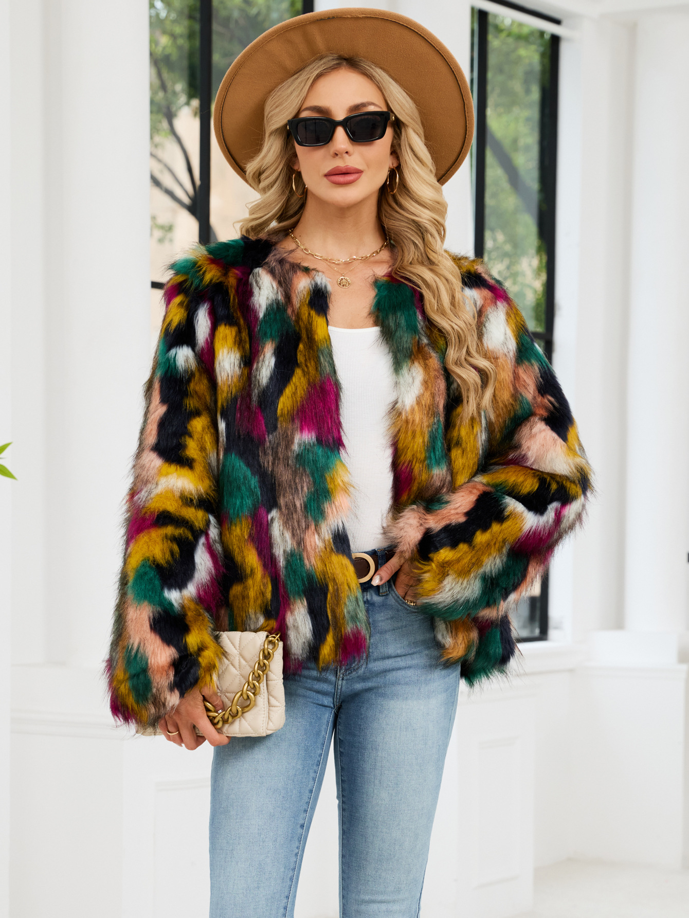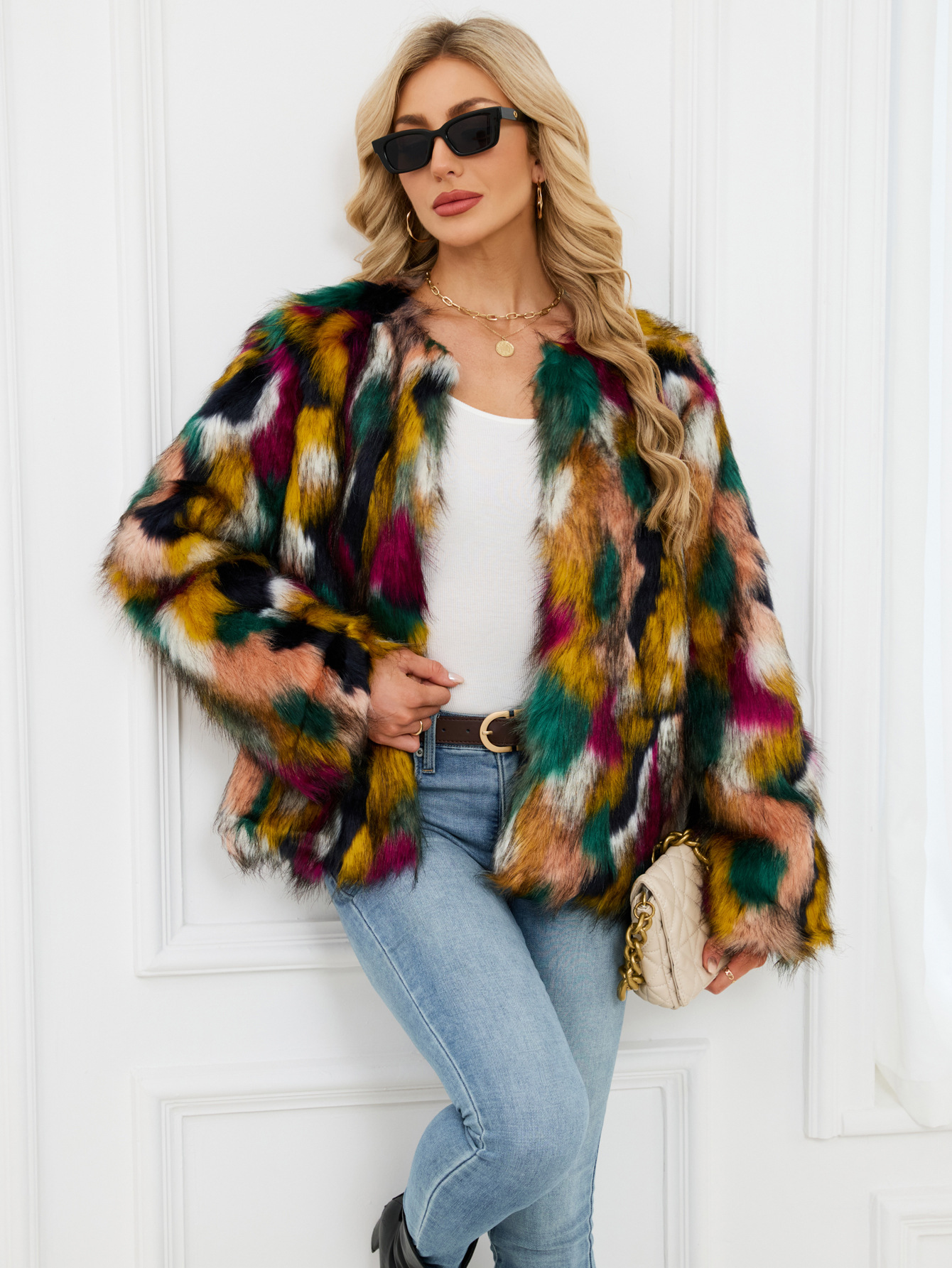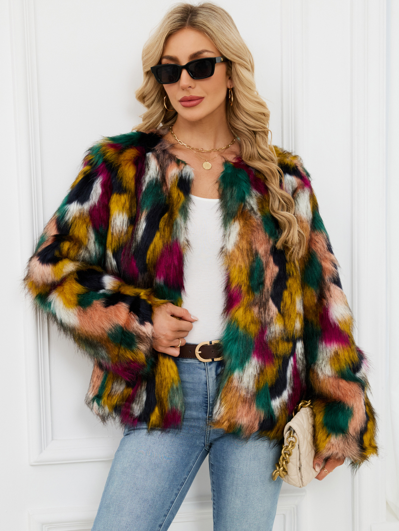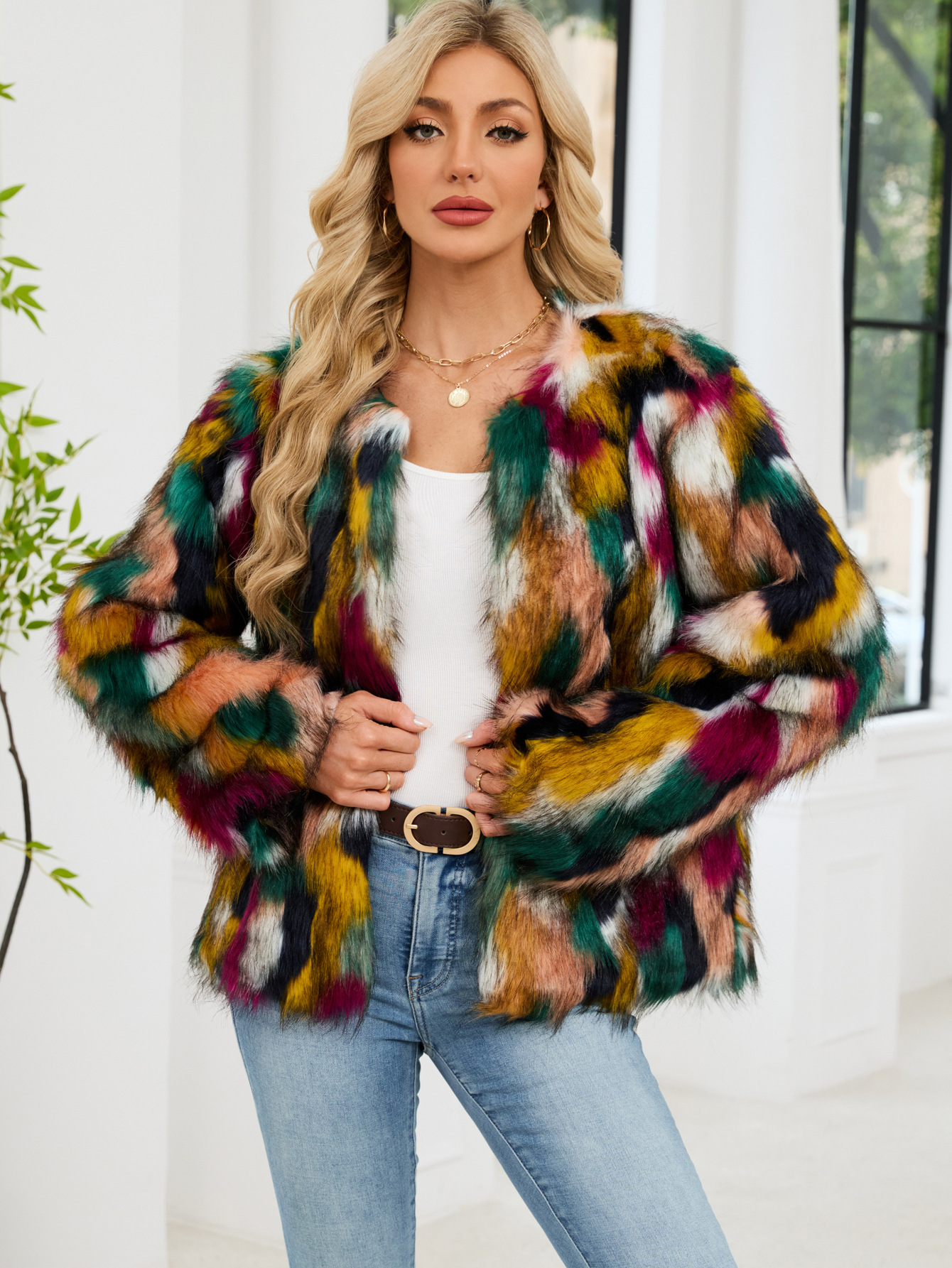 Colorful Fur Faux Fur Coat Short Long Sleeve Collarless Casual Women Winter Faux Fur Coat