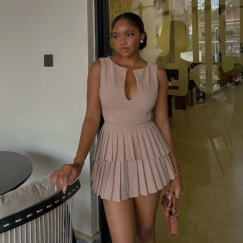 Fresh Sweet V neck High Waist Slimming Pleated A line Dress Short Dress