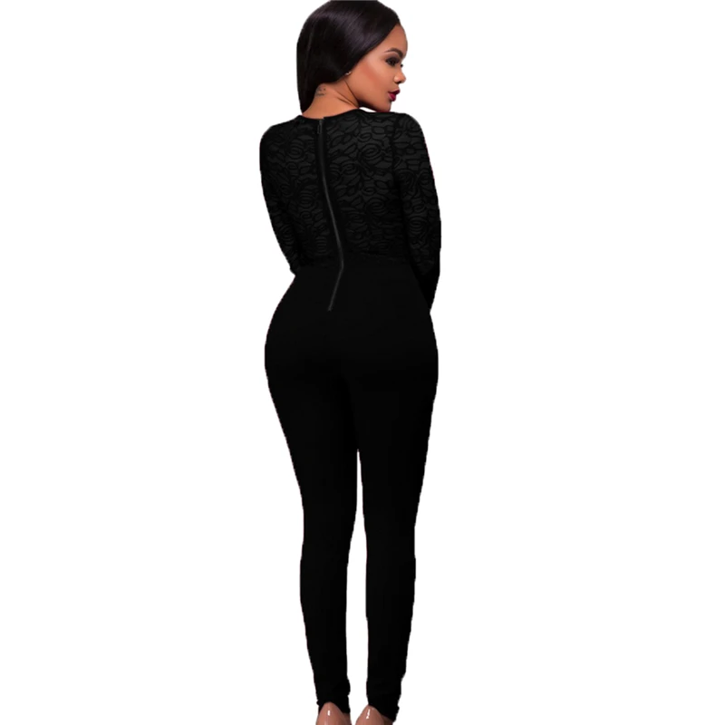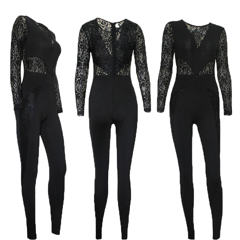 Vogue Ladies Black Lace Jumpsuits women long sleeve sexy jumpsuits female fashion stretchy casual jumpsuits Long Romper clubwear